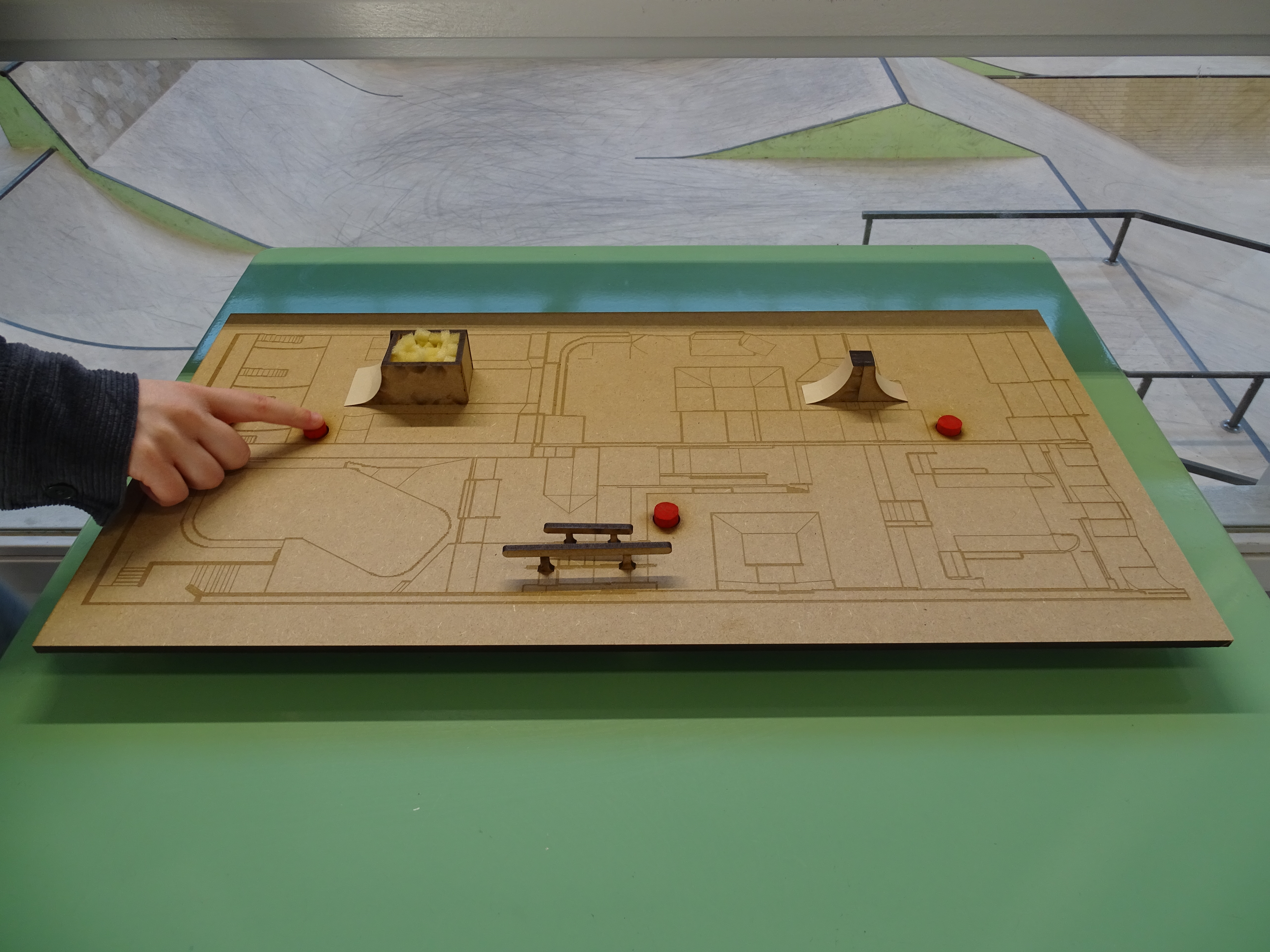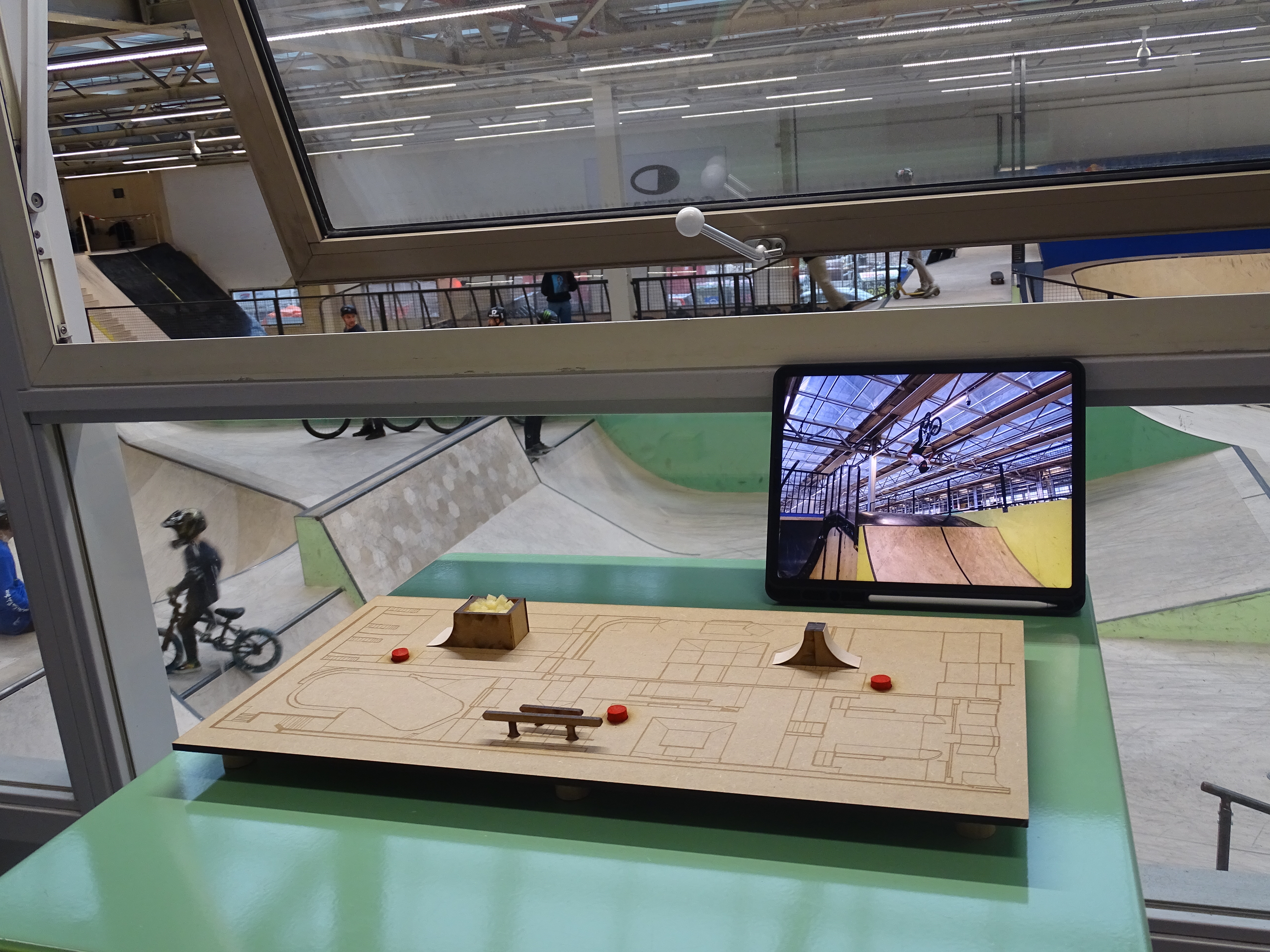 AREA 51 is an indoor skatepark where athletes do sports and visitors watch. This place is renovated and ready to become a popular place. However, at this moment, the interaction between the visitors and the athletes is not there. So, this interaction needs to be enhanced by innovation. We, students from this course, took the opportunity to design something for this challenge. We designed ‘Skate Cam’, a camera which is controlled by the visitors and makes pictures of the athletes. The visitors can push a button and make photos of the athletes in action. By viewing these photos on screens in AREA 51, everyone can see the pictures. In this way, we hope to improve the interaction between visitors and athletes and the overall experience of AREA 51.