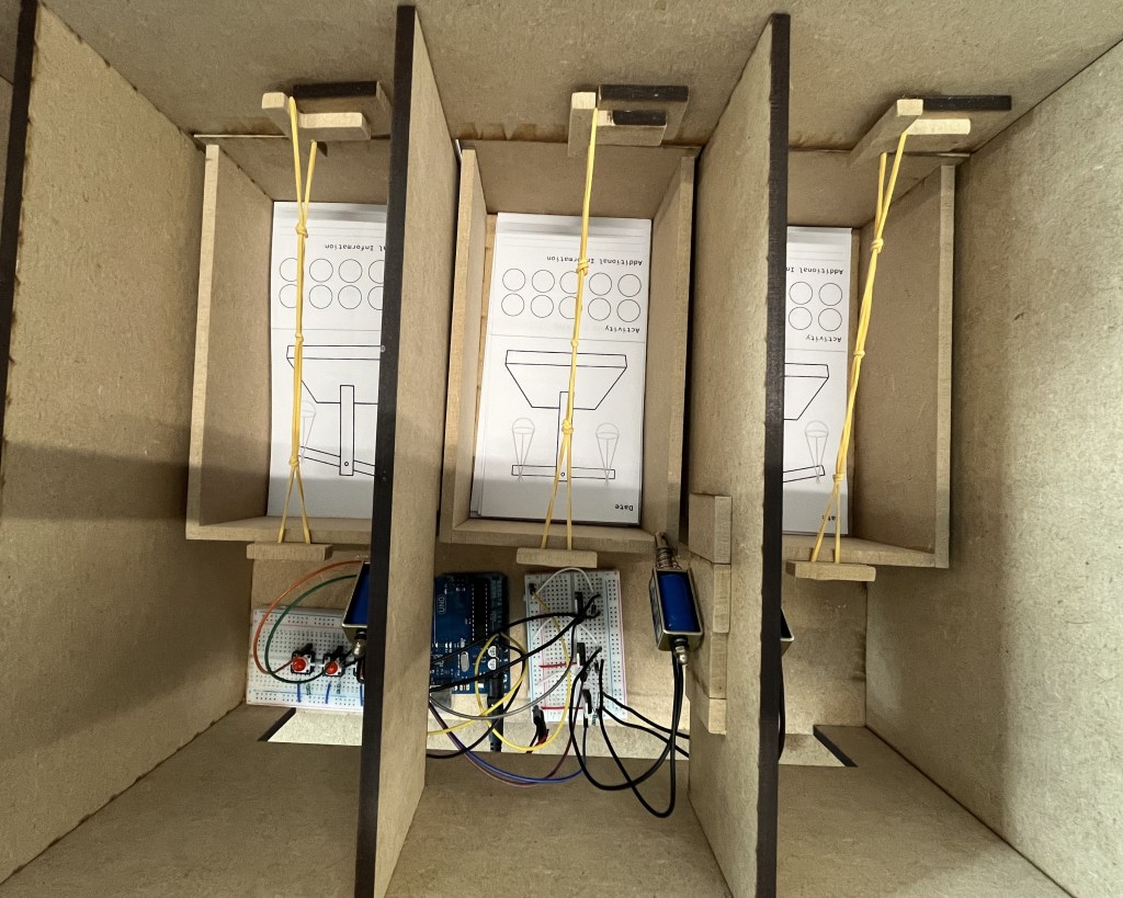 Throughout my final bachelor project I used of the laser cutter extensively. For my first iteration of the toolbox I created a very simple design structure. This structure was improved upon, to make the toolbox more sturdy. Drawers were later also added as an additional feature. The pouches were made with a sowing machine and the weight difference was made using balancing weights. For the toolbox, some basic, but new, electronics were used to automate the opening of the drawers. Solenoids were used to prevent the drawers from opening. A rubber band was used to create tension, which lead to a sliding drawer when the solenoid is no longer holding the drawer.
