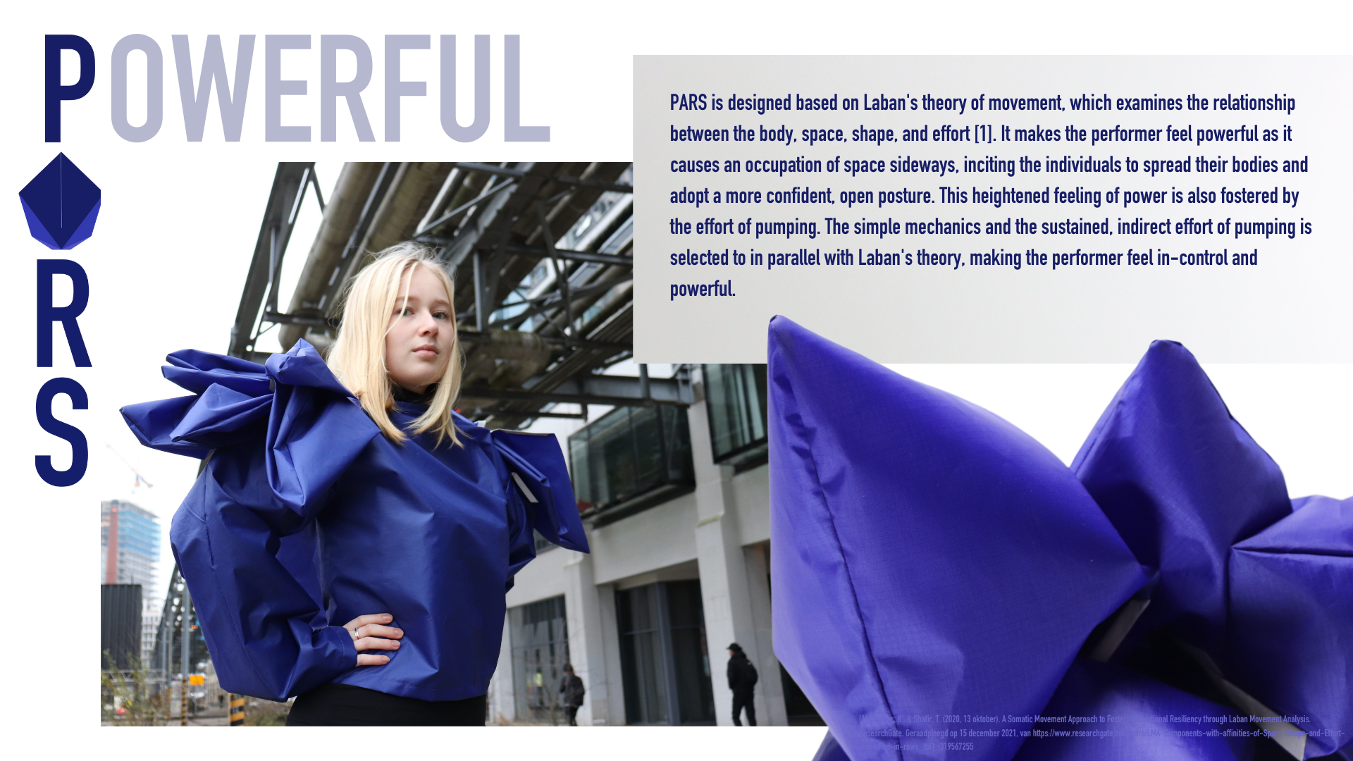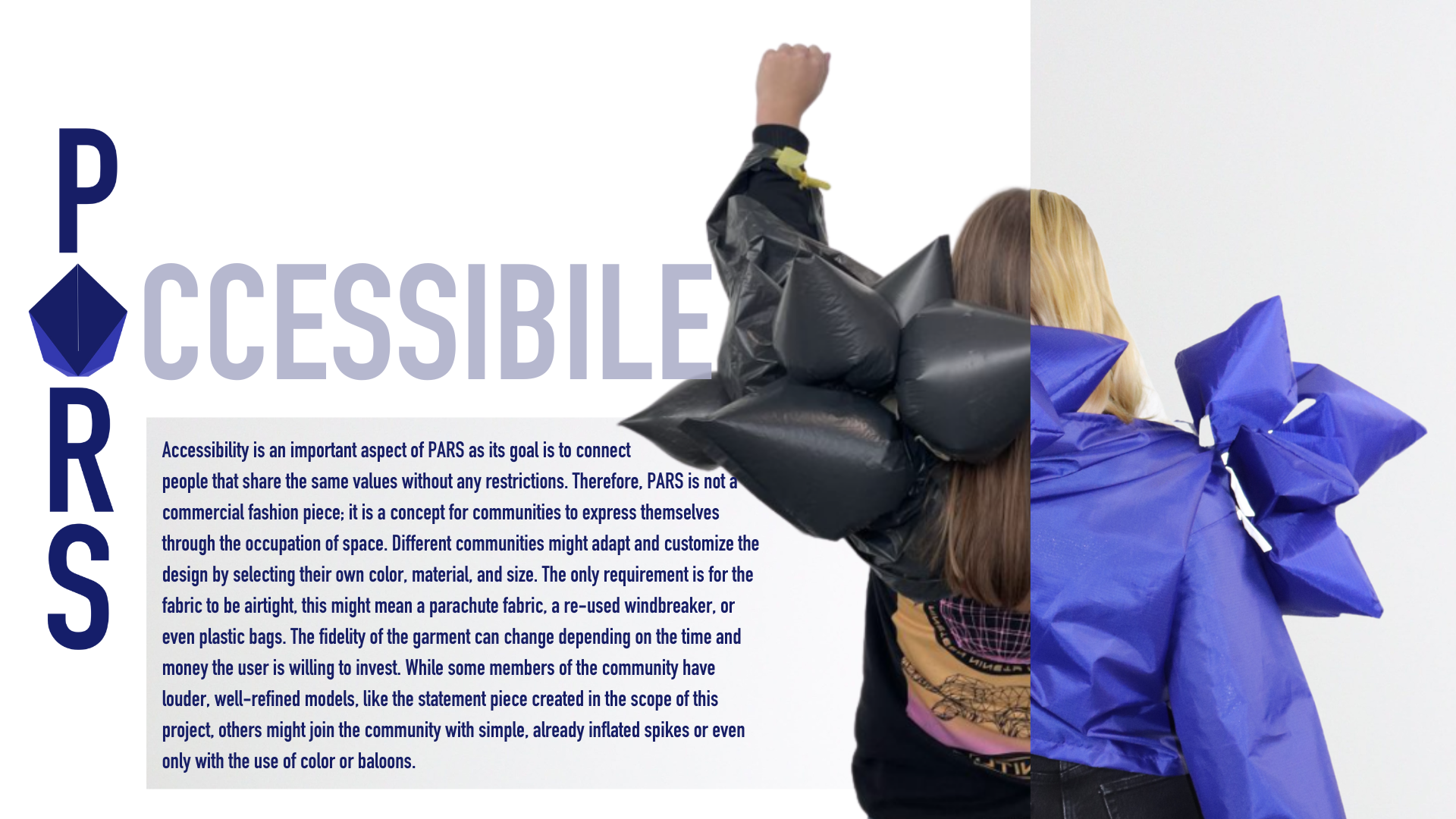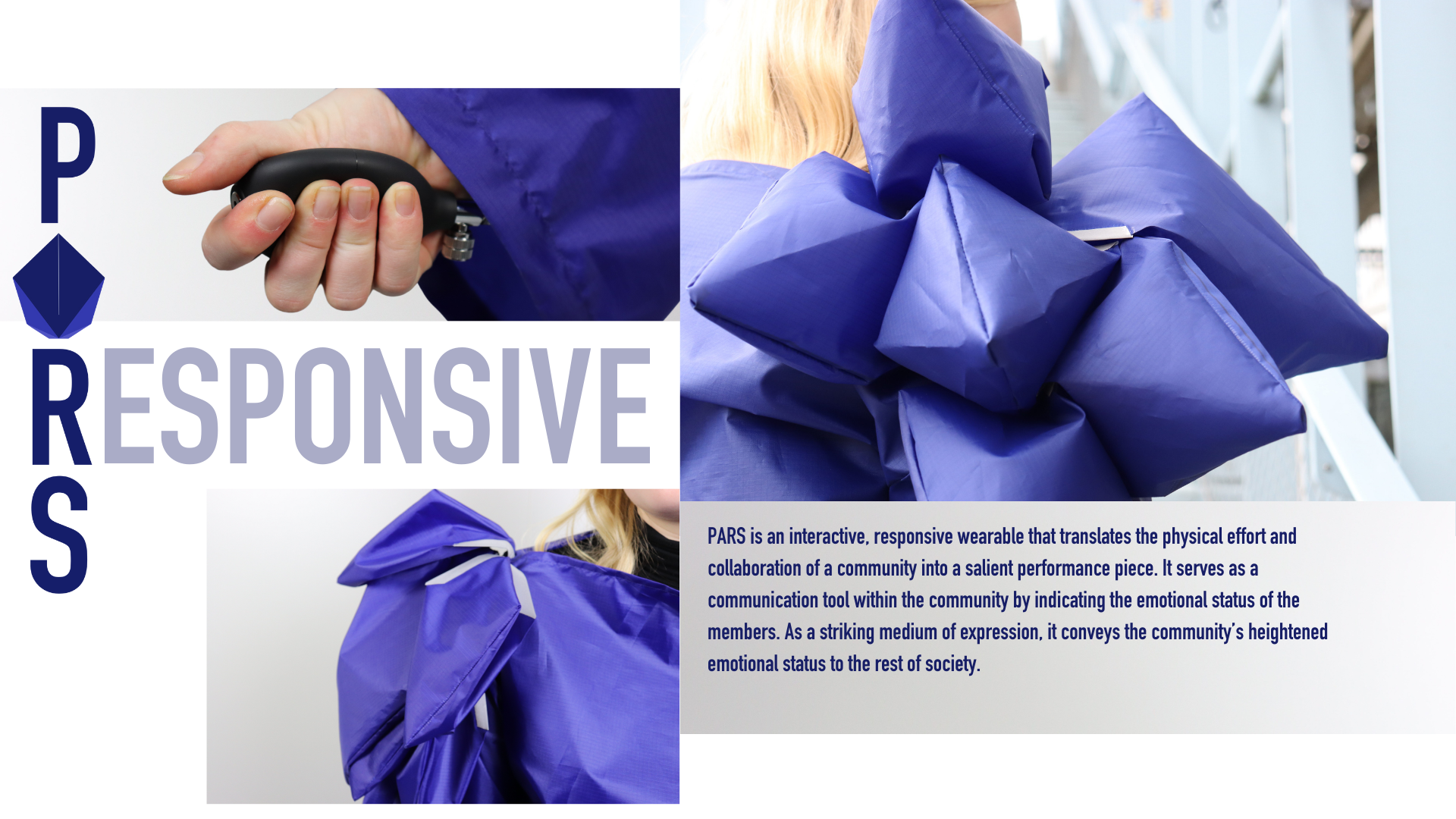 Expressing your stance and making yourself heard as a community requires power and solidarity. As a society, we have been trying to achieve this through various ways ranging from creative performances to protests. Seeking a new medium through which communities can express themselves, we designed PARS: an inflatable responsive wearable that makes individuals feel powerful and connected by making use of physical occupation of space. The concept is based upon Laban’s theory of movement which examines the relationship between the body, space, shape, and effort. It incites power in the user by claiming space in the horizontal reach around the body. As PARS is a non-commercial concept for communities to adapt the concept of using space for expression, it is highly customizable and accessible. It responds to the user’s physical effort and translates it to an expressive performance; which also creates a deeper connection within the community and fosters solidarity.