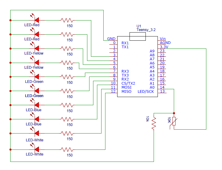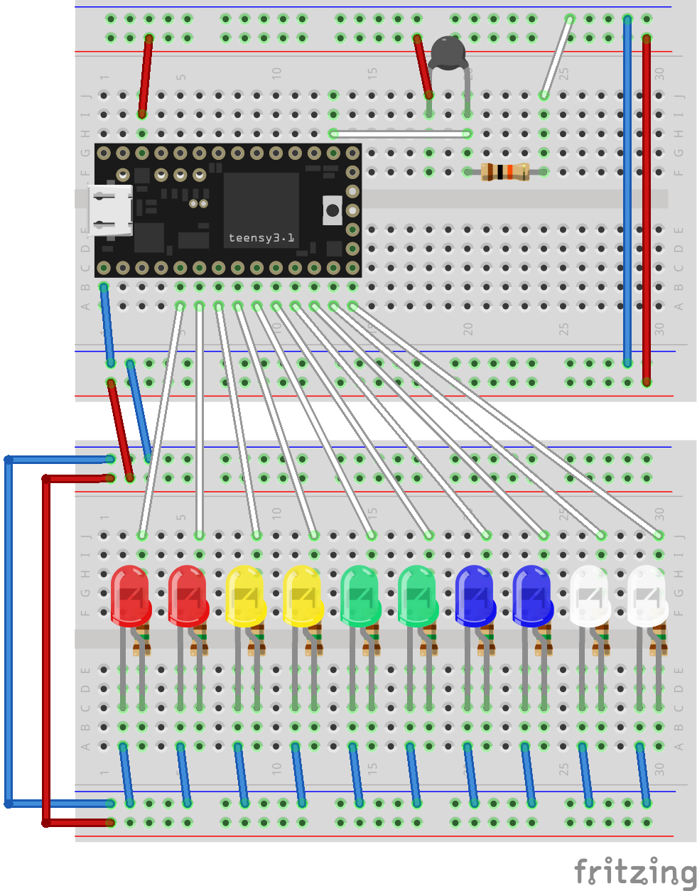 The Wear-o-Meter helps you decide what to wear, based on the weather. The outside temperature will be measured by the NTC. The LEDs will then indicate the outside temperature. So you are able to decide what to wear.